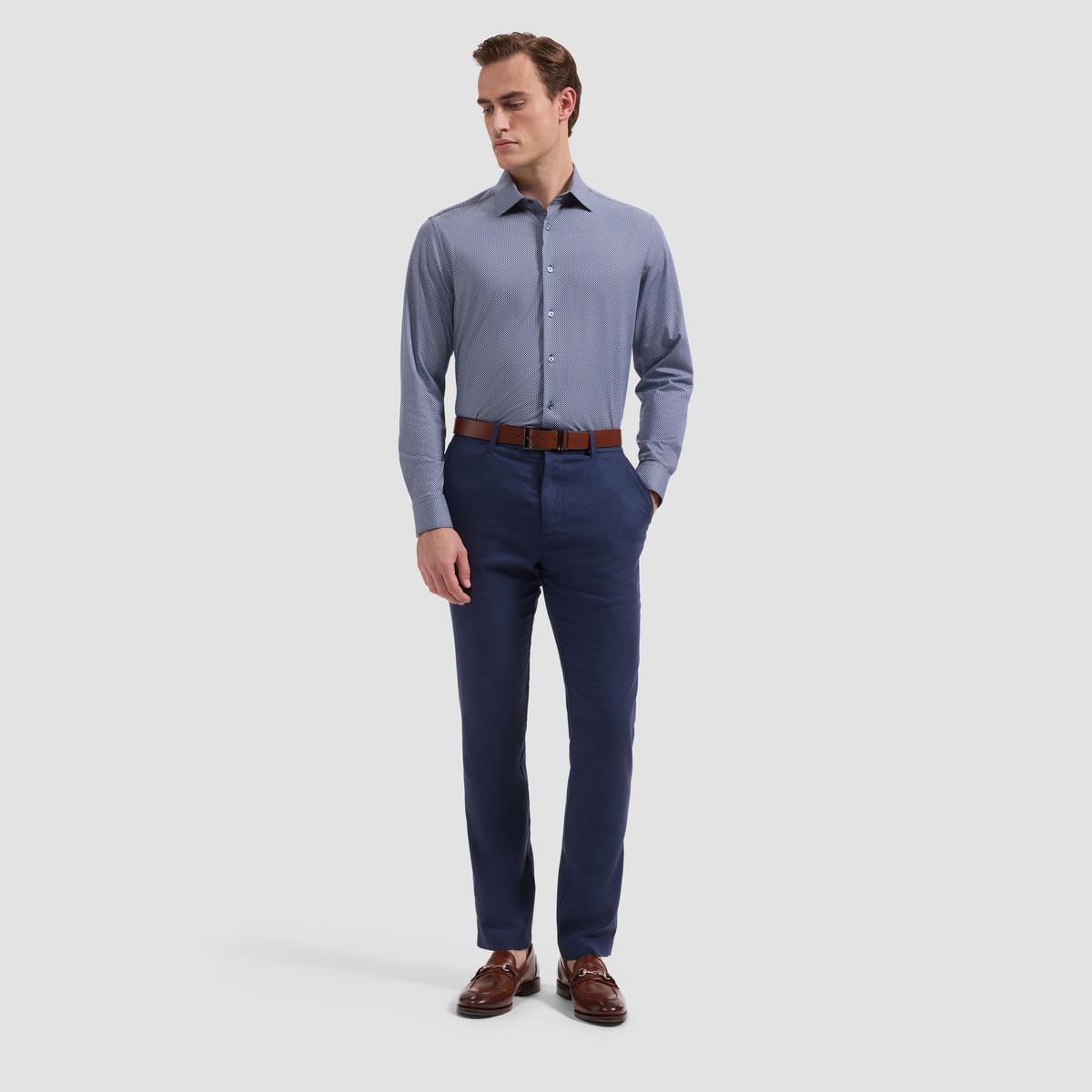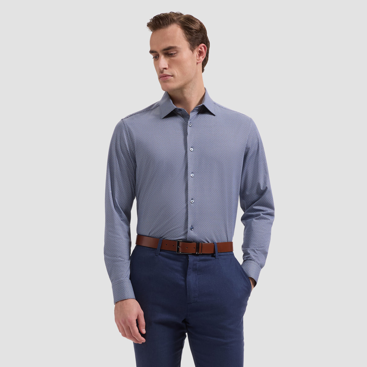 The James OoohCotton® long-sleeve shirt combines refined style with performance. A geometric print and point collar create visual interest, while genuine mother-of-pearl buttons and a curved hem deliver polished sophistication—wear it tucked or untucked with equal confidence. Crafted from signature OoohCotton® double-mercerized fabric, this shirt features 8-way stretch, moisture-wicking, and quick-dry technology for all-day comfort. Wrinkle-resistant and thermally regulating, it handles whatever your day demands. Adjustable notched cuffs convert to accommodate cufflinks for versatile styling. 92% cotton, 8% spandex. Machine wash. Imported.