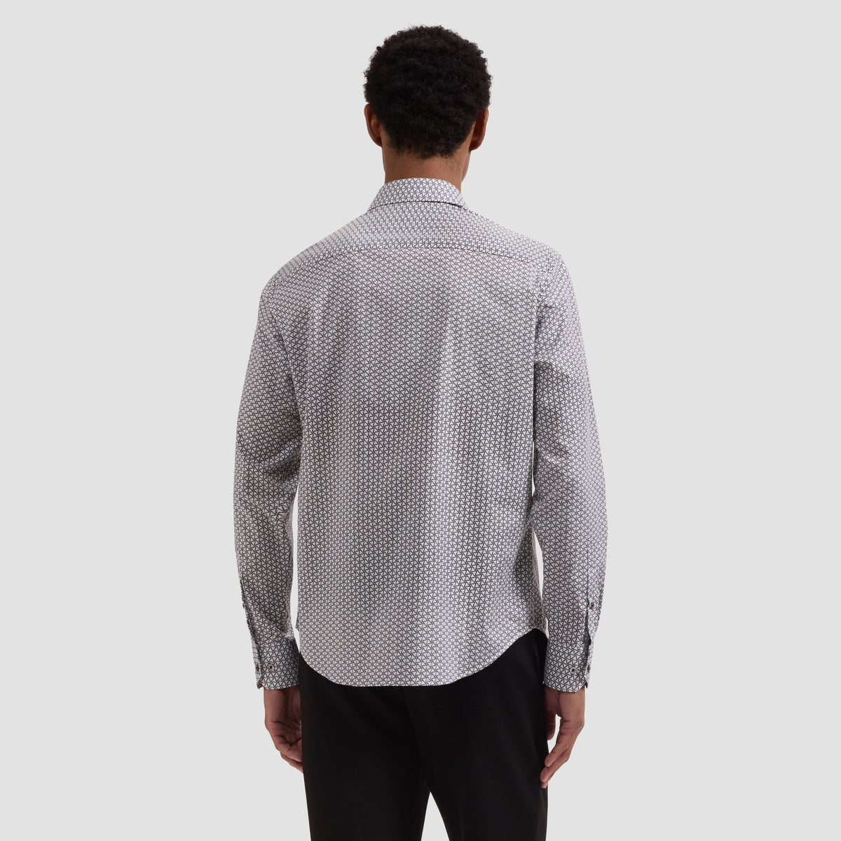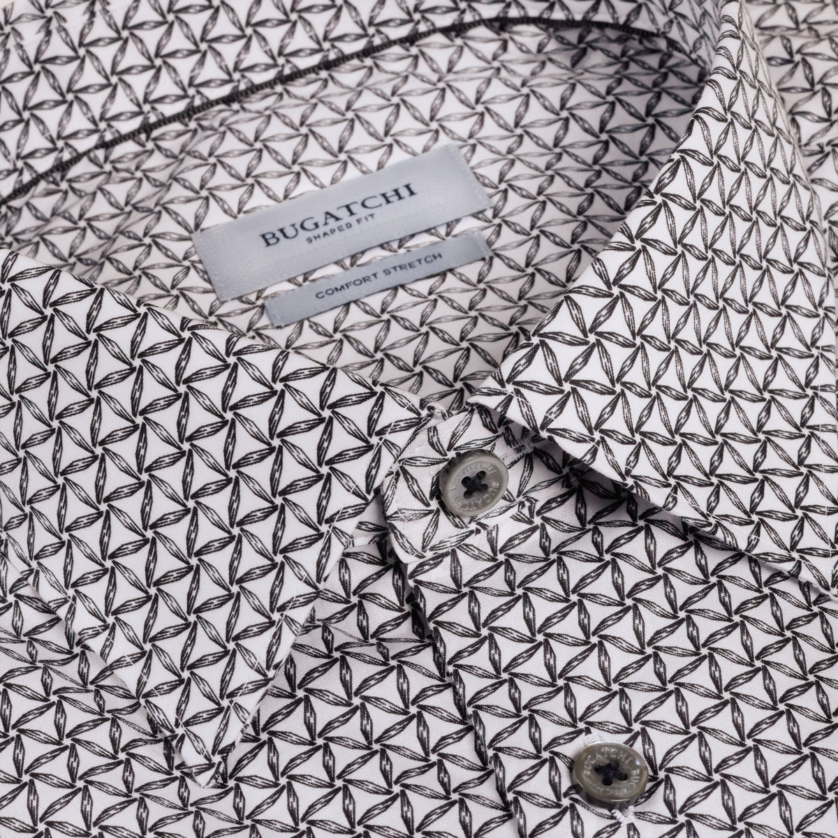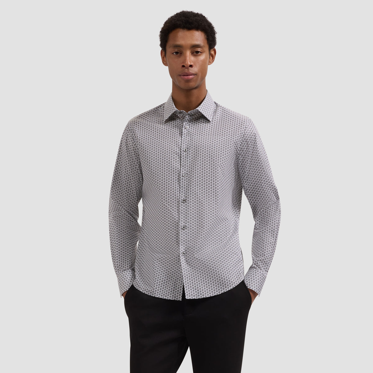 The Julian long-sleeve Comfort Stretch shirt combines premium cotton with added spandex for effortless all-day wear. Its geometric pinwheel print brings visual interest to any wardrobe, while the point collar and genuine mother-of-pearl buttons deliver refined polish. Adjustable notched cuffs convert for cufflinks, offering versatility for both casual and formal occasions. The natural cotton base breathes beautifully, resists wrinkles, and maintains its shape through countless washes. Whether tucked or untucked, this imported shirt moves with you—perfect for the modern man who values comfort without compromise. Material: 95% Cotton, 5% Spandex Machine wash for easy care